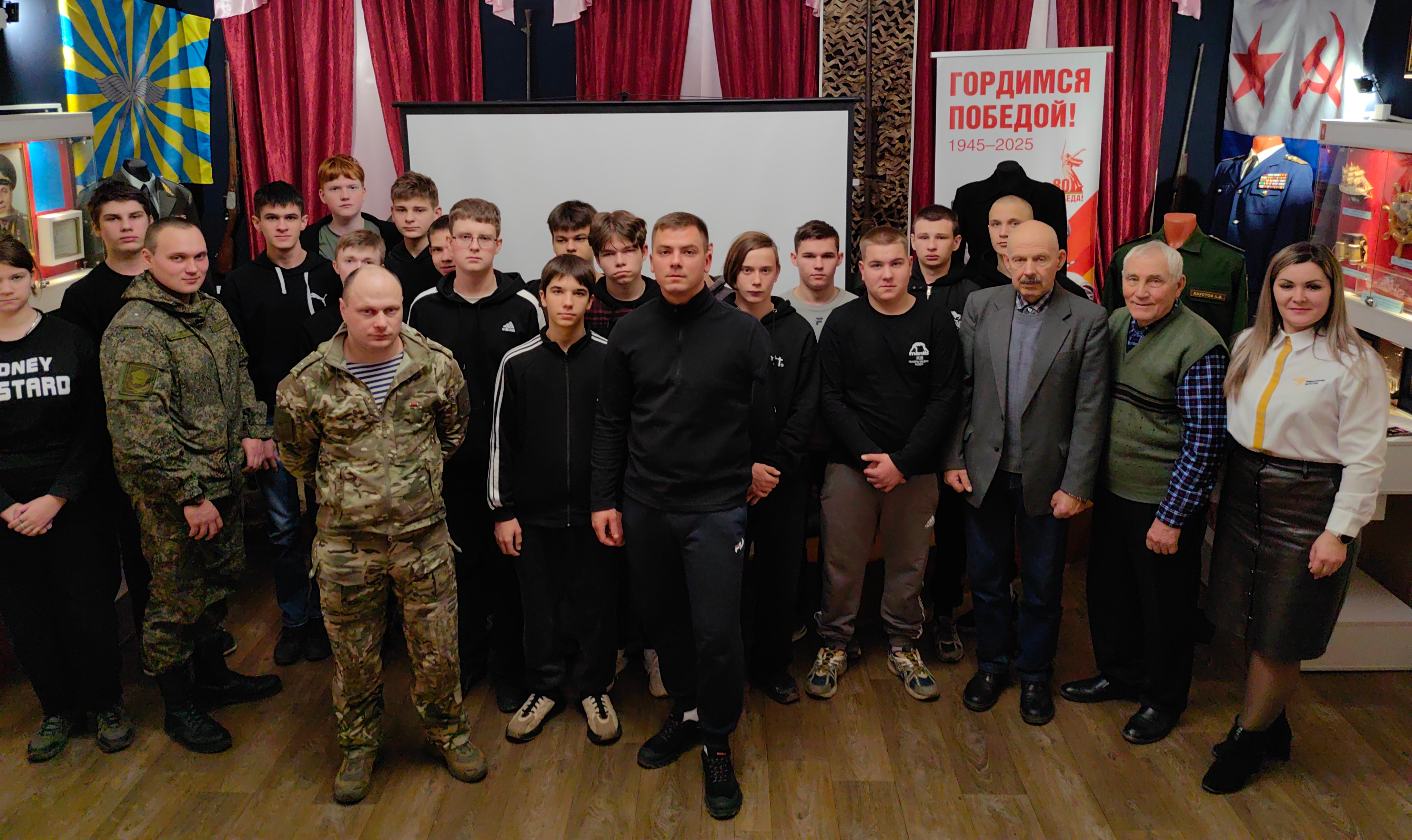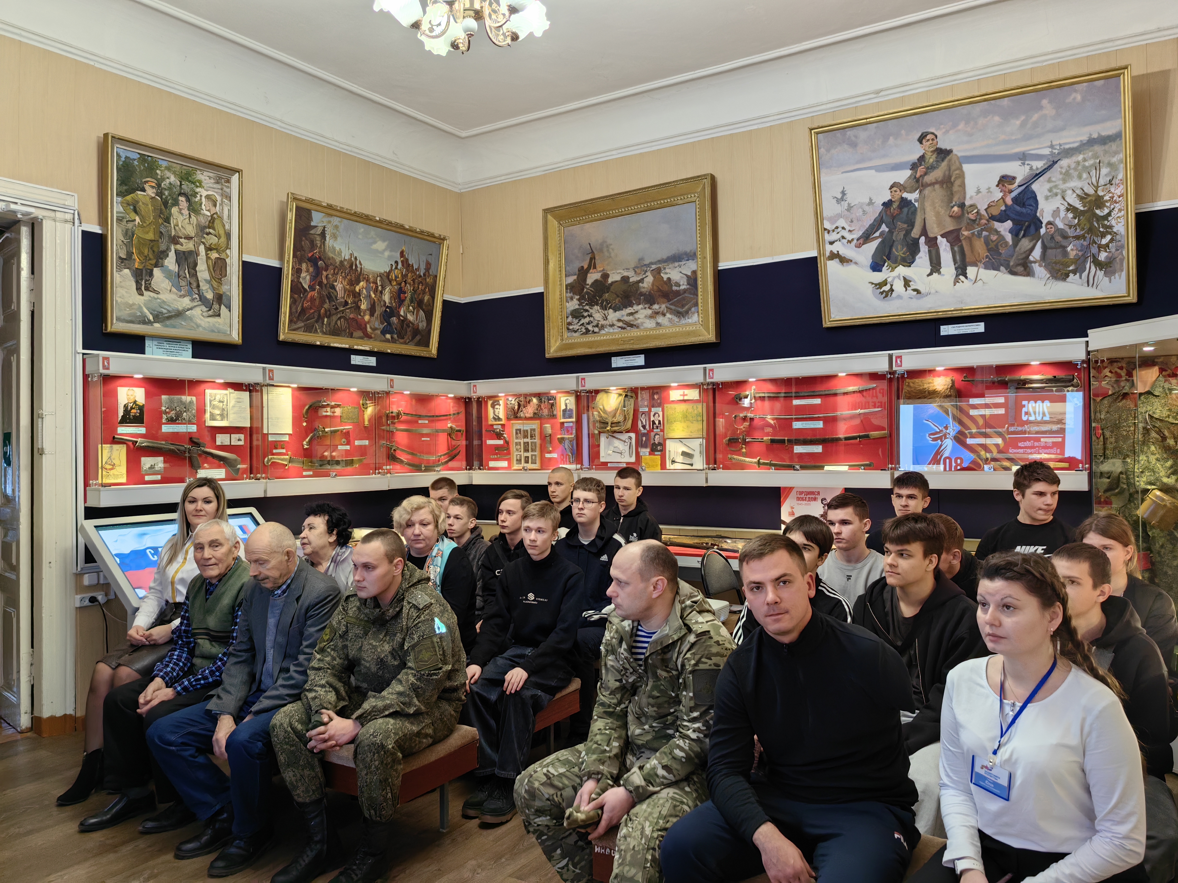 На уроке мужества «ГОРДИМСЯ ВАМИ, ГЕРОИ ОТЕЧЕСТВА!», посвящённом памятной дате России, Дню героев Отечества, присутствовали студенты Трубчевского политехнического техникума (рук. Рак Н.А.) и гости: Шапошников Николай Савельевич - ответственный секретарь Трубчевского райсовета ветеранов; Стройло Анатолий Николаевич – ветеран Вооружённых Сил и участник СВО в добровольческом отряде «БАРС» (Брянск); участники специальной военной операции: Солодков Андрей Васильевич - лейтенант, старший специалист - эксперт Трубчевского военкомата; Бородуля Дмитрий Иванович - прапорщик, ответственный исполнитель Трубчевского военкомата; Цыганков Алексей Игоревич – ветеран боевых действий; Гнедова Юлия - социальный координатор брянского филиала фонда «Защитники Отечества» в г. Трубчевск .